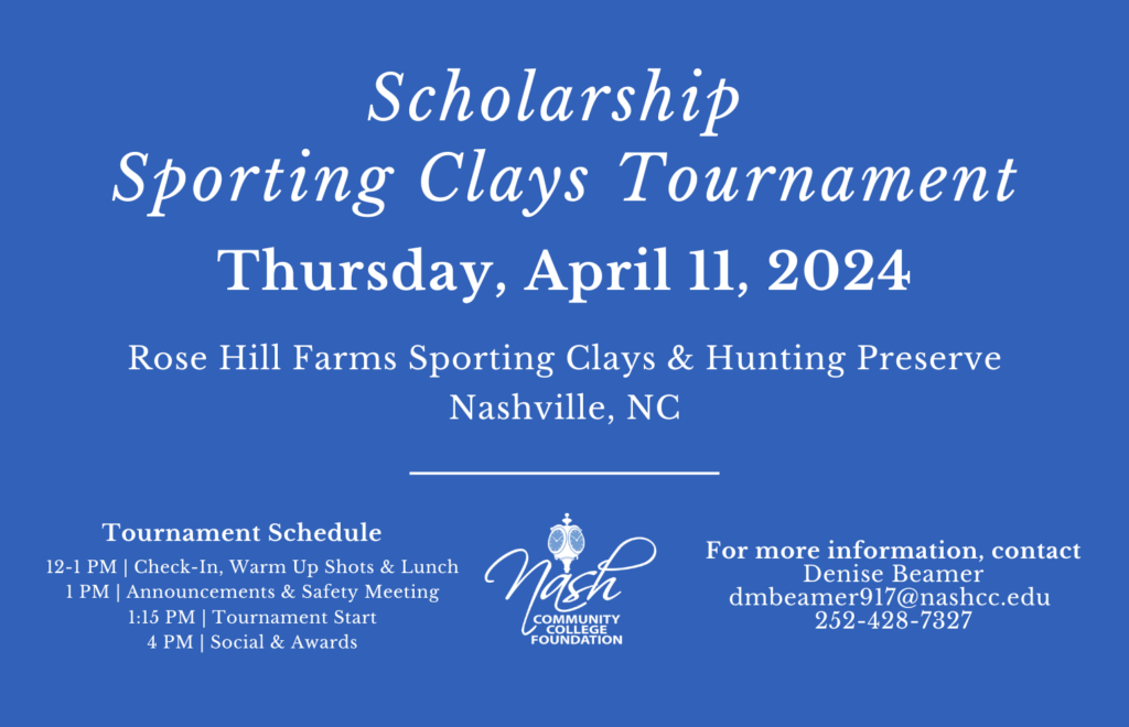 Nash Community College’s Foundation will host its annual Sporting Clays Tournament on Thursday, April 11. The tournament will run from 12 p.m. until 4 p.m. at Rose Hill Farms Sporting Clays & Hunting Preserve.